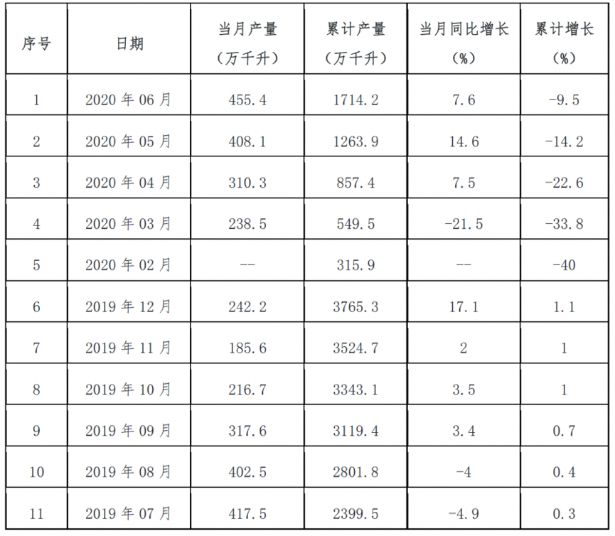 表 2 近一年中國白酒(折65度,商品量)產(chǎn)量及增速統(tǒng)計(jì)表