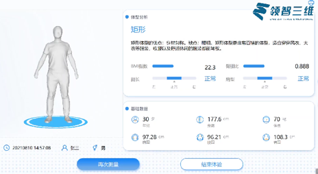 • 陜西領智三維研發的三維人體掃描系統通過設備自帶的多角度3D深度相機設備迅速捕捉到投射于人體表面的光感,通過提取形成圖像,自動重構出三維圖像上的人體形態特征,前后僅用時幾秒鐘,便完成關鍵三維數據采集。